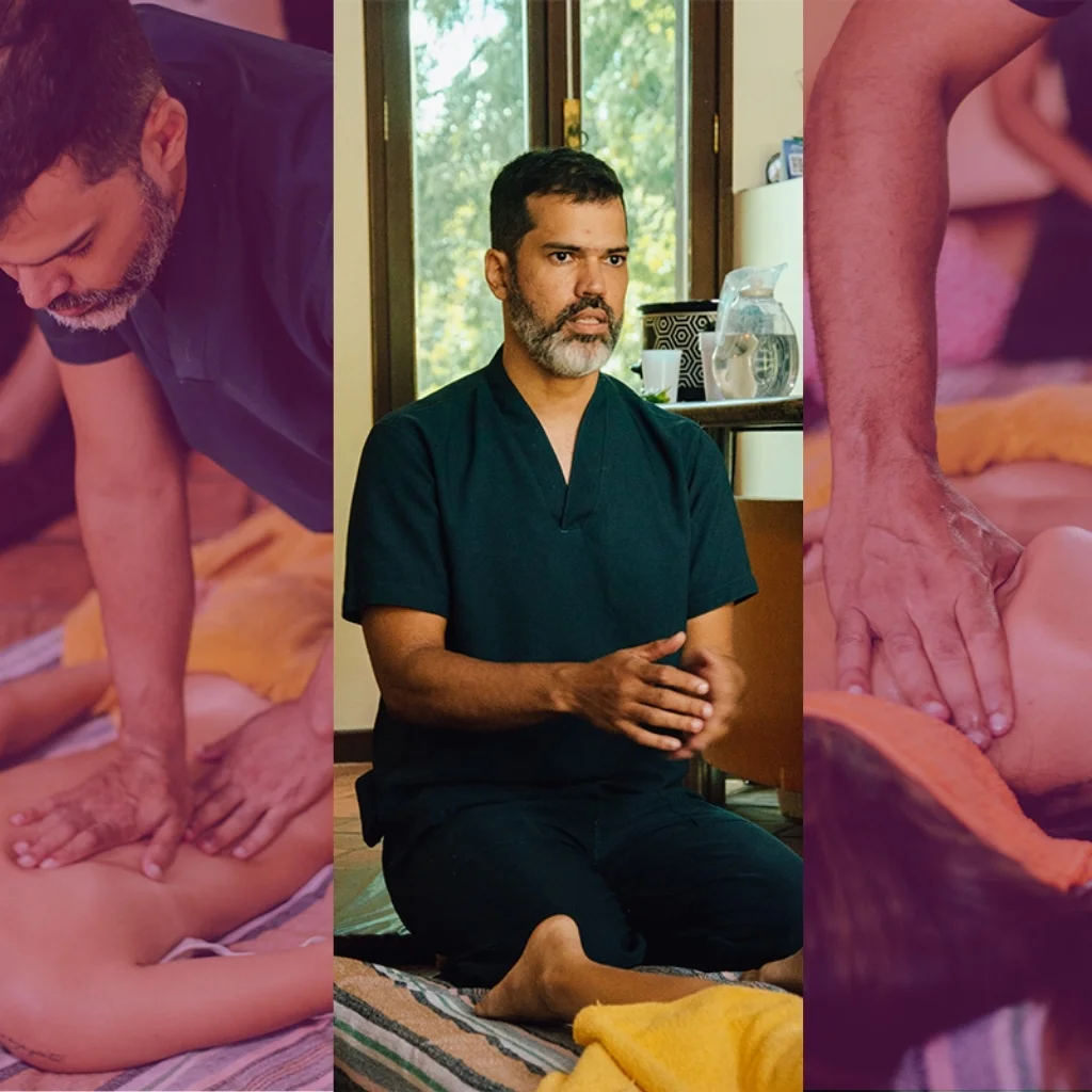 Sou Adriano Ponte, terapeuta corporal há mais de 10 anos, com formações em Reflexologia Podal, Massagem Ayurvédica e Thai Massagem. Desenvolvi a Massagem com Bastões unindo a força da bambuterapia, a sabedoria do Ayurveda e a fluidez da Thai, criando uma técnica profunda e precisa que cuida do corpo com leveza, ritmo e equilíbrio energético.